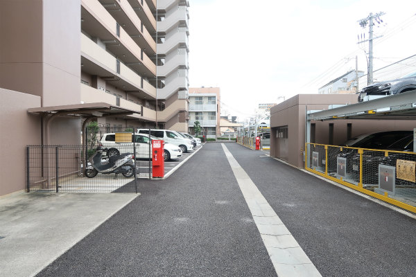 ・マンション前面の通りからエントランスから道路まで約10mあり開放感が