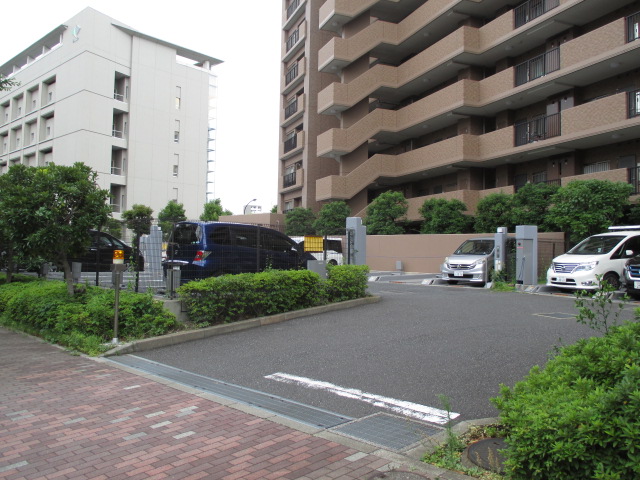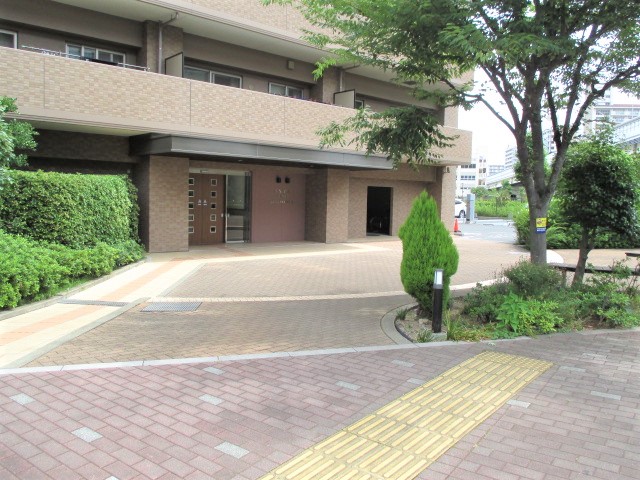 (後ろにあるアースカラーのマンションが当物件です。)