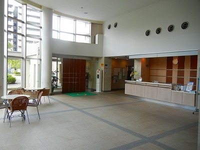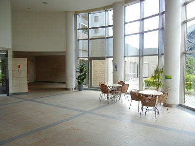吹き抜け、ガラス貼りの明るいエントランスラウンジ