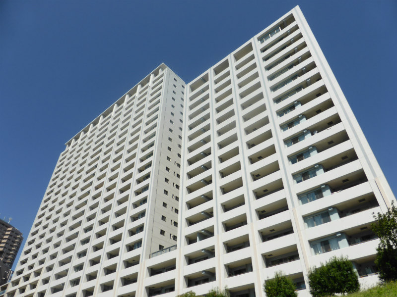 白を基調とした515世帯が暮らす大規模マンションの外観。